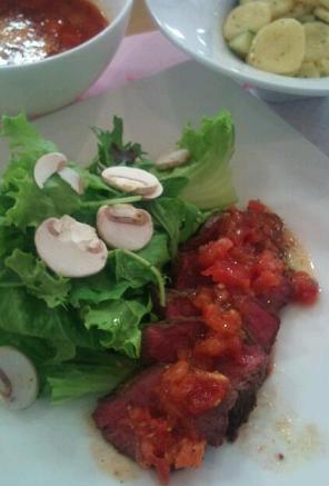 牛肉のタリアータ・・焼き色をつけた塊肉をホイルで包んで、余熱で火を通した料理